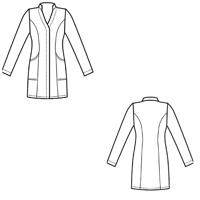 Modello sagomato, femminile con allacciatura centrale a bottoni a pressione coperti.